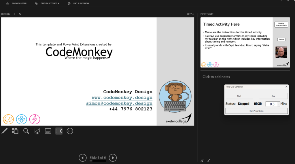 You can continue with the slide whilst it is running. If you have a slide which follows which already has a timer on it, and move to that slide the timer continues running. This means with a little preparation you can run a time over 2 or more slides!