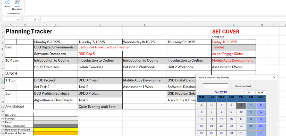 In the template sheet, organise your timetable and codes as you need. There is a custom ribbon bar at the top under “CodeMonkey”. Pressing the Insert New Sheets button gives you a dialog box